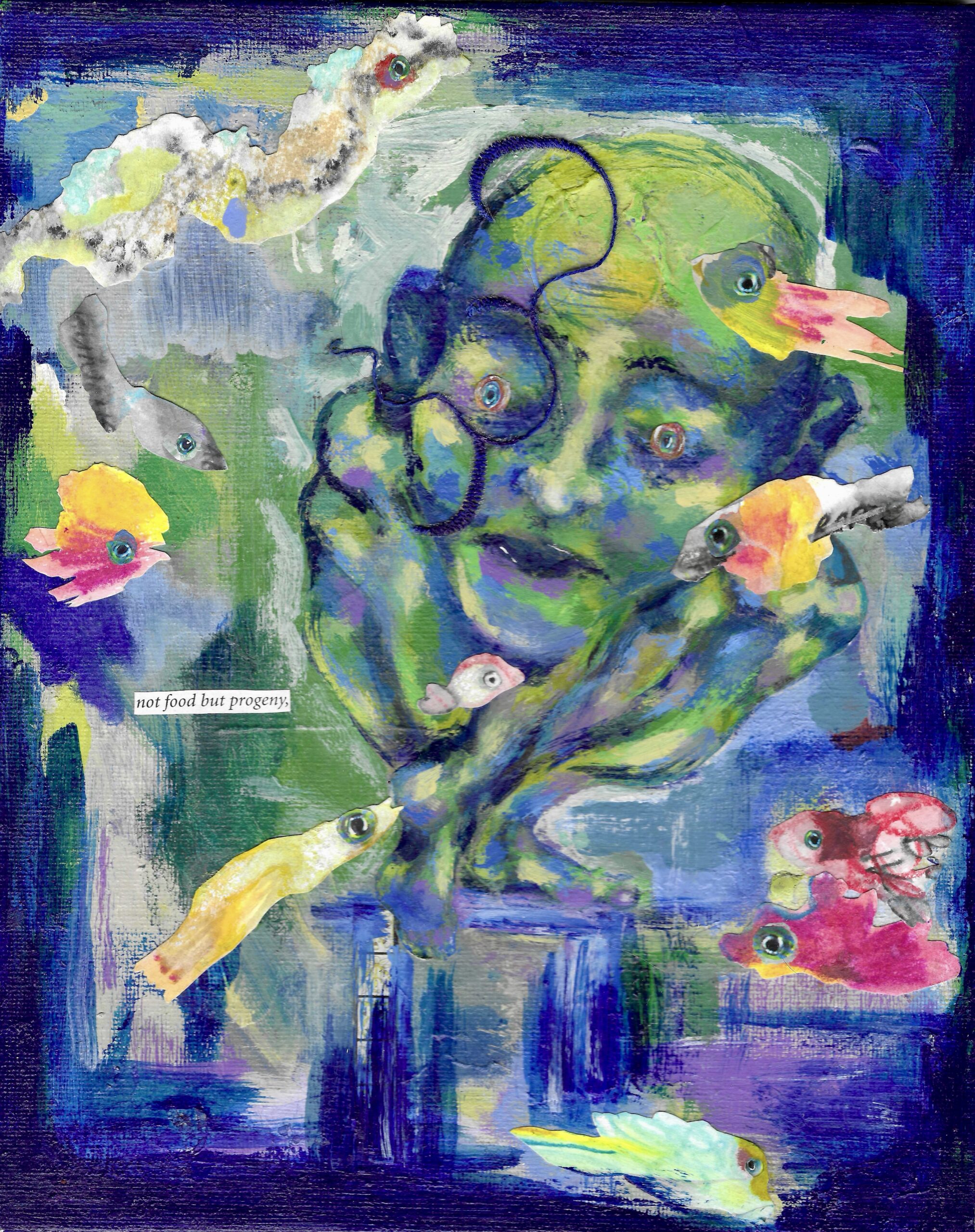 Uly makes art about multiplicity, connection, and in-betweens. “Not food but progeny” explores fluidity, being a fish, and the interconnectivity of fishes.